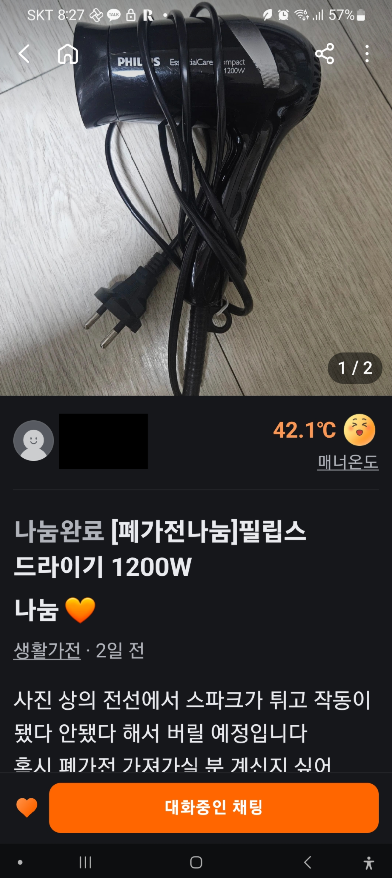 전선을 움직이면 스파크가 발생한다는 헤어드라이어를 무료나눔으로 받아와서